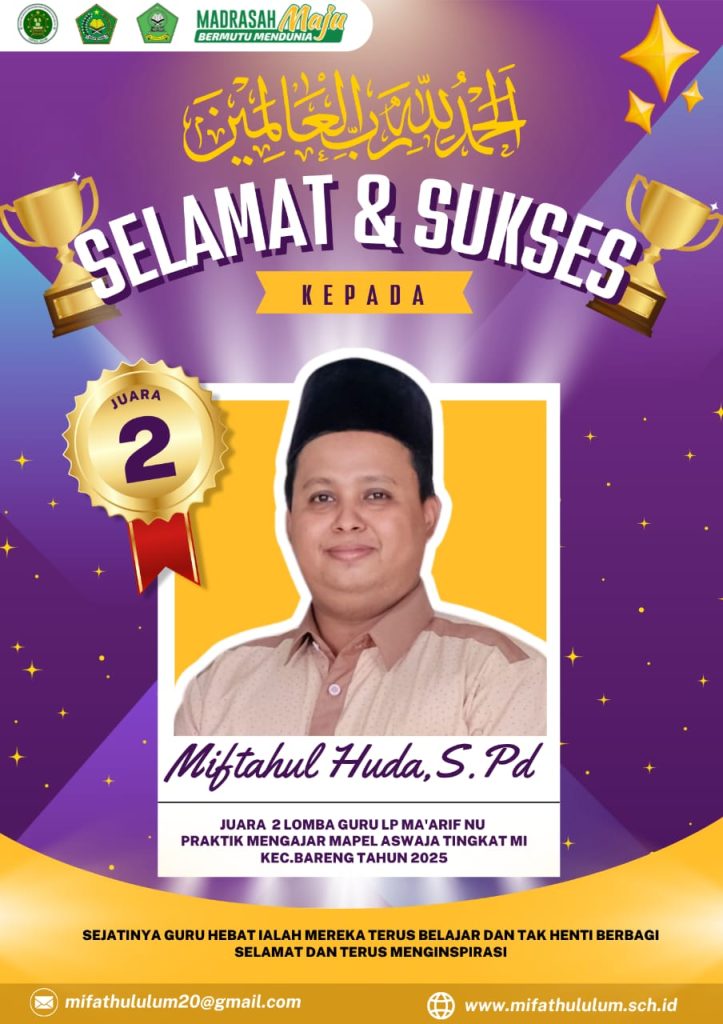 Jombang, Suarabangilmedia.com– Prestasi membanggakan kembali diraih oleh civitas MI Fathul Ulum. Pak Takul berhasil meraih Juara 2 Lomba Praktik Mengajar Aswaja, sebuah pengakuan atas kemampuan profesionalnya dalam menerapkan nilai-nilai Ahlussunnah wal Jamaah di kelas, sekaligus menjadi inspirasi bagi guru-guru lain di lingkungan sekolah.