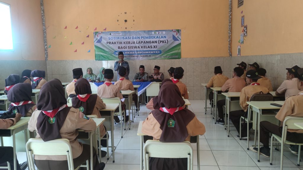 Sukorejo, Suarabangilmedia.com – Pagi itu, Sabtu 8 November 2025, aula MA Plus Al Hikmaturrohmaniyah Mojotengah berubah menjadi ruang penuh energi dan semangat belajar. Satu per satu siswa kelas XI dari jurusan Desain Komunikasi Visual (DKV) dan Teknik Sepeda Motor (TSM) tampak fokus menyimak paparan yang disampaikan para narasumber. Sebanyak 37 peserta hadir dalam kegiatan Sosialisasi dan Pembekalan Praktik Kerja Lapangan (PKL), sebuah program yang dirancang untuk mengasah kesiapan mental, keterampilan, dan karakter profesional siswa sebelum terjun ke dunia industri.