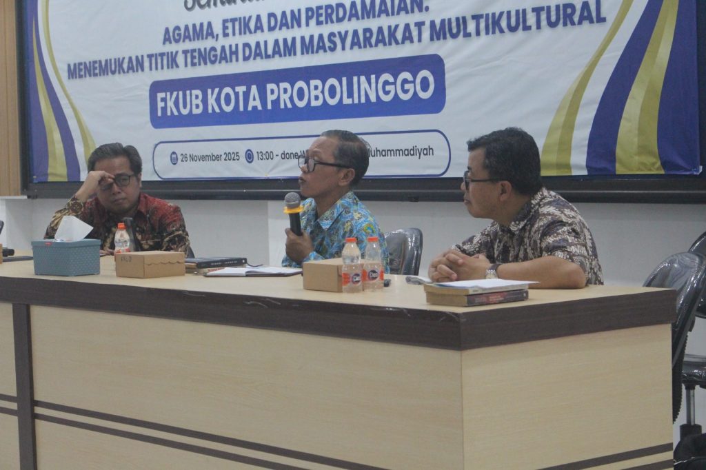 Probolinggo, suarabangilmedia.com – Forum Kerukunan Umat Beragama (FKUB) Kota Probolinggo menggelar Seminar Nasional, dengan tema “Agama, Etika dan Perdamaian: Menemukan Titik Tengah dalam Masyarakat Multikultural” . Dalam acara ini juga dilakukan pengukuhan Pengurus Forum Kader Muda Penggerak Moderasi Beragama (FKM PMB) Periode 2025-2026. Pelaksanaan acara pada tanggal 26 Nopember 2025 di Aula PD. Muhammadiyah Kota Probolinggo Jalan Sutoyo.